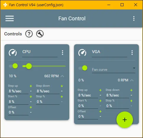 우측하단의 '+' 버튼을 눌러 다양한 팬,센서,그래프등을 원하는 만큼 추가 가능합니다.